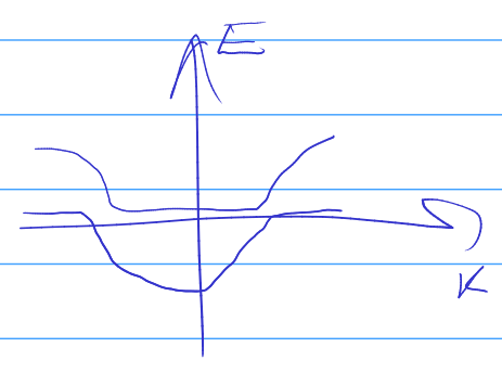 And we’re interested in t_1 \gg t_2. Let’s see what this gives. First, if t_2 = 0, then we’re looking at 2 bands. One with \varepsilon = \varepsilon_0 and another with \varepsilon = \varepsilon_0 - 2t_1 \cos(ka). These bands always have a large separation in energy \sim t_1 except at the point where \cos(ka) = 0 (k = \pm \pi/2a), where these two simpler dispersion relations cross at \varepsilon = \varepsilon_0. This is, once again if we neglect t_2 completely. However if we do remember that t_2 is finite, we get the energies of the two bands equal to \varepsilon_0 \pm t_2 at the point where two bands are the closest to each other.