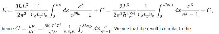 C = \frac{3L^3 k_B^4}{2 \pi^2 \hbar^3 v_x v_y v_z} T^3 \int_0^{\hbar \kappa_D/k_B T}\frac{x^4 e^x}{(e^x - 1)^2} \mathrm{d}x