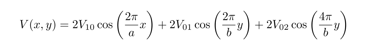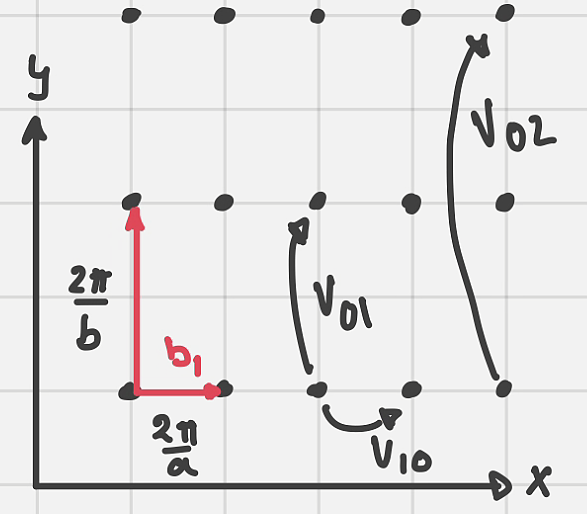 Yup, that’s right. If we use the potential and the notation above, then V_{mn} couples wavevectors that are m \overrightarrow{b_1} + n \overrightarrow{b_2} reciprocal lattice vectors apart.